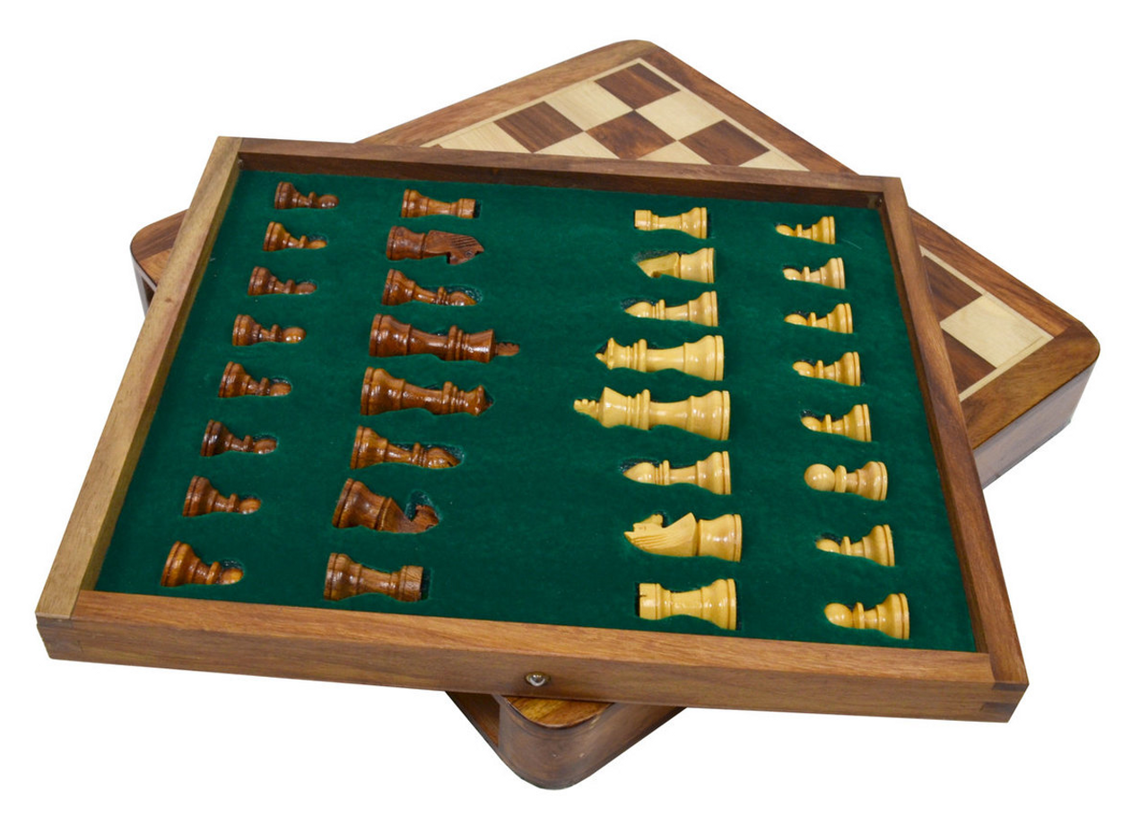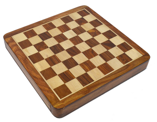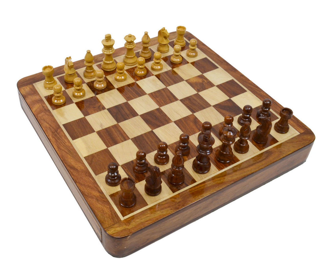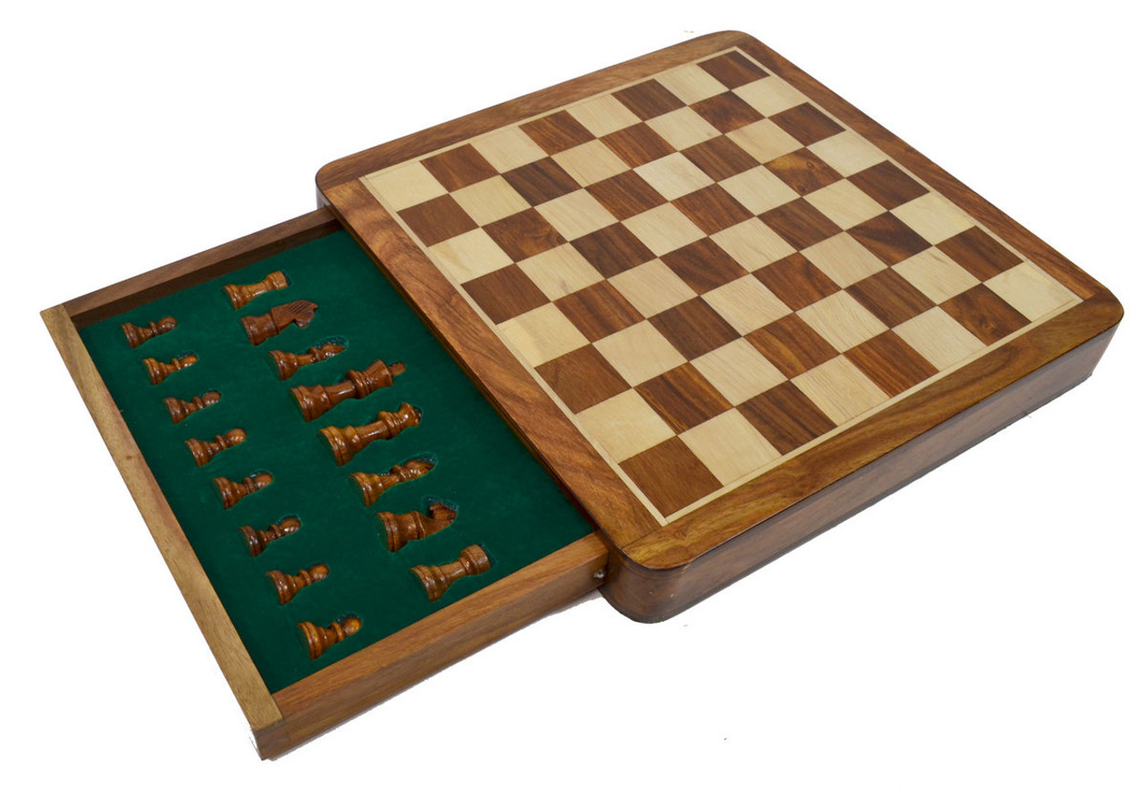 This 10" magnetic chess set features an 8.25" playing surface, a 1.75" king, and 1" magnetic squares to keep pieces secure during play. The built-in drawer includes individual storage slots to neatly organize and protect each piece when not in use—perfect for travel, home, or casual play.