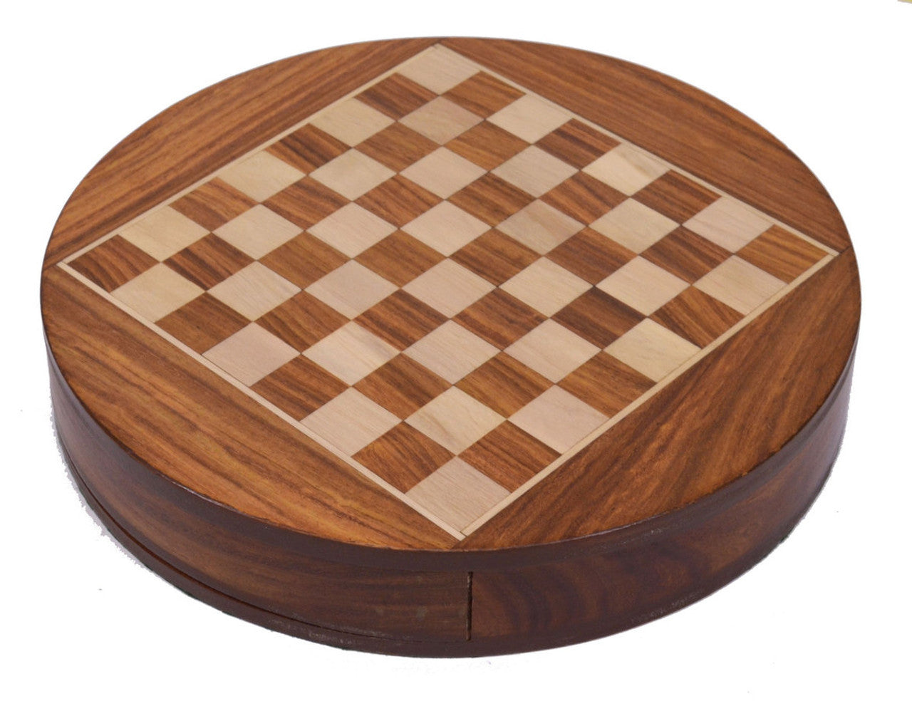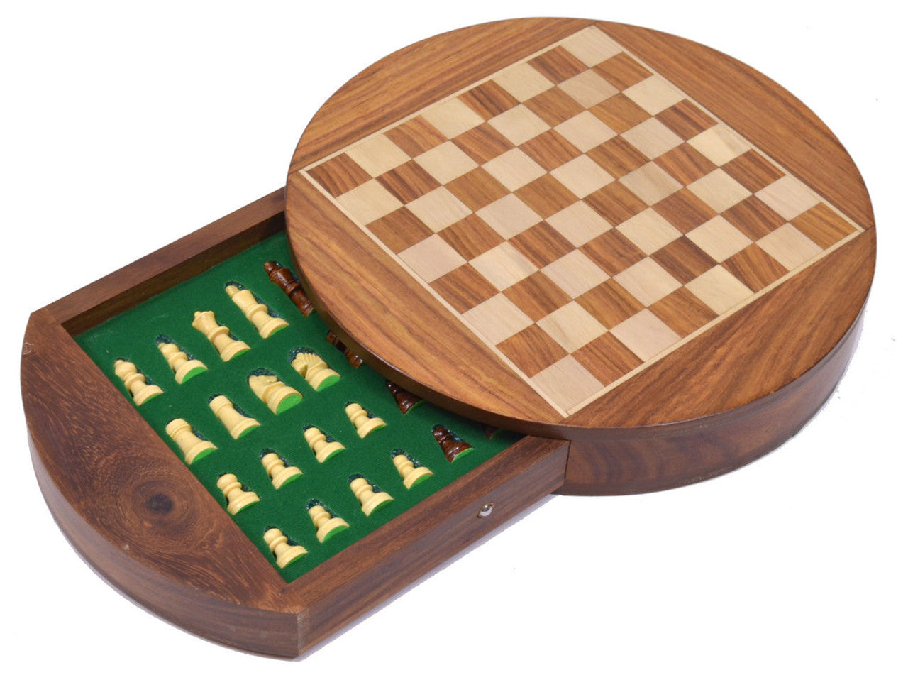 This unique 9″ round magnetic chess set features a 6″ playing surface and a 1.25″ king. Strong magnetic pieces hold firmly in place, making it ideal for travel or casual play. The built-in storage drawer keeps all pieces neatly organized and protected when not in use, ensuring the set is always ready for your next game.