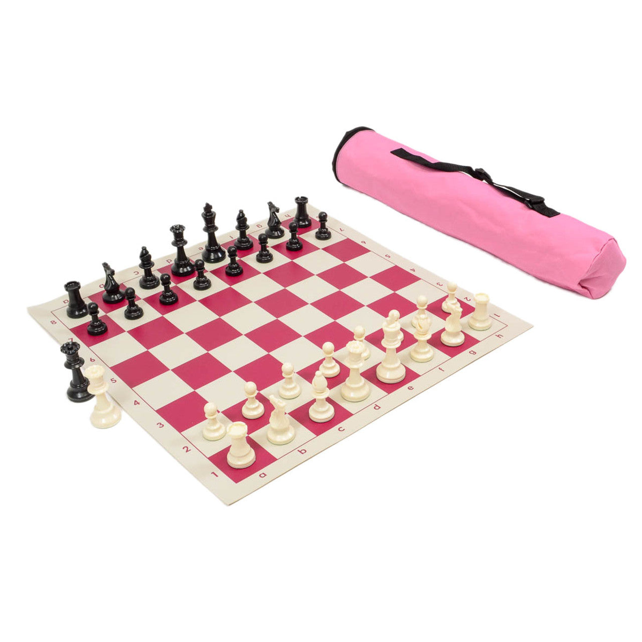 Practical chess set combining unweighted plastic club pieces, a sturdy canvas archer-style bag, and a flexible vinyl roll-up board. The set features 3.75" king-height pieces with paper felt bases, a 21" x 3.75" archer bag designed to hold both the rolled-up board and pieces, and a 20" x 20" vinyl board marked with algebraic notation. Ideal for players seeking a compact, organized, and travel-ready solution for school, club, or casual play.