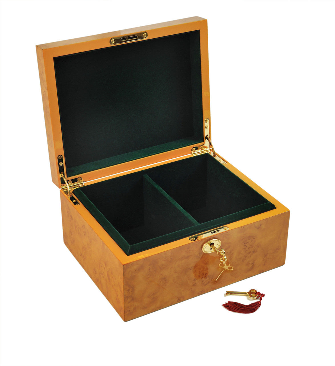 Elegant burlwood-pattern chess storage box with a green felt-lined interior and single divider. Designed to securely hold chess pieces sized up to a 4″ king, it offers both protection and presentation for your set. Perfect for clubs, schools, tournaments, or personal collections, this box combines style, durability, and function.