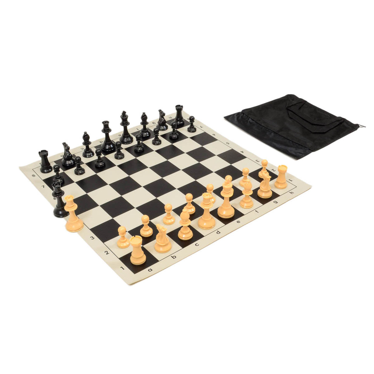 Complete chess set featuring solid plastic club pieces with paper felt bases, a durable reinforced nylon starter bag, and a flexible vinyl roll-up board. The set includes a full 32-piece collection plus an extra queen in each color, a spacious 12" x 9" starter bag with a sleeve for the board, and a 20" x 20" vinyl board marked with algebraic notation. Perfect for schools, clubs, and players seeking a convenient and organized travel-ready chess solution.