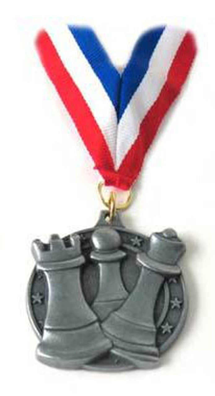 2.25" diameter silver diecast chess medal paired with a 30" red, white, and blue ribbon for a bold, patriotic presentation. Designed for durability and visual appeal, this medal is perfect for tournaments, school competitions, or club awards, offering a timeless round design with a professional finish.