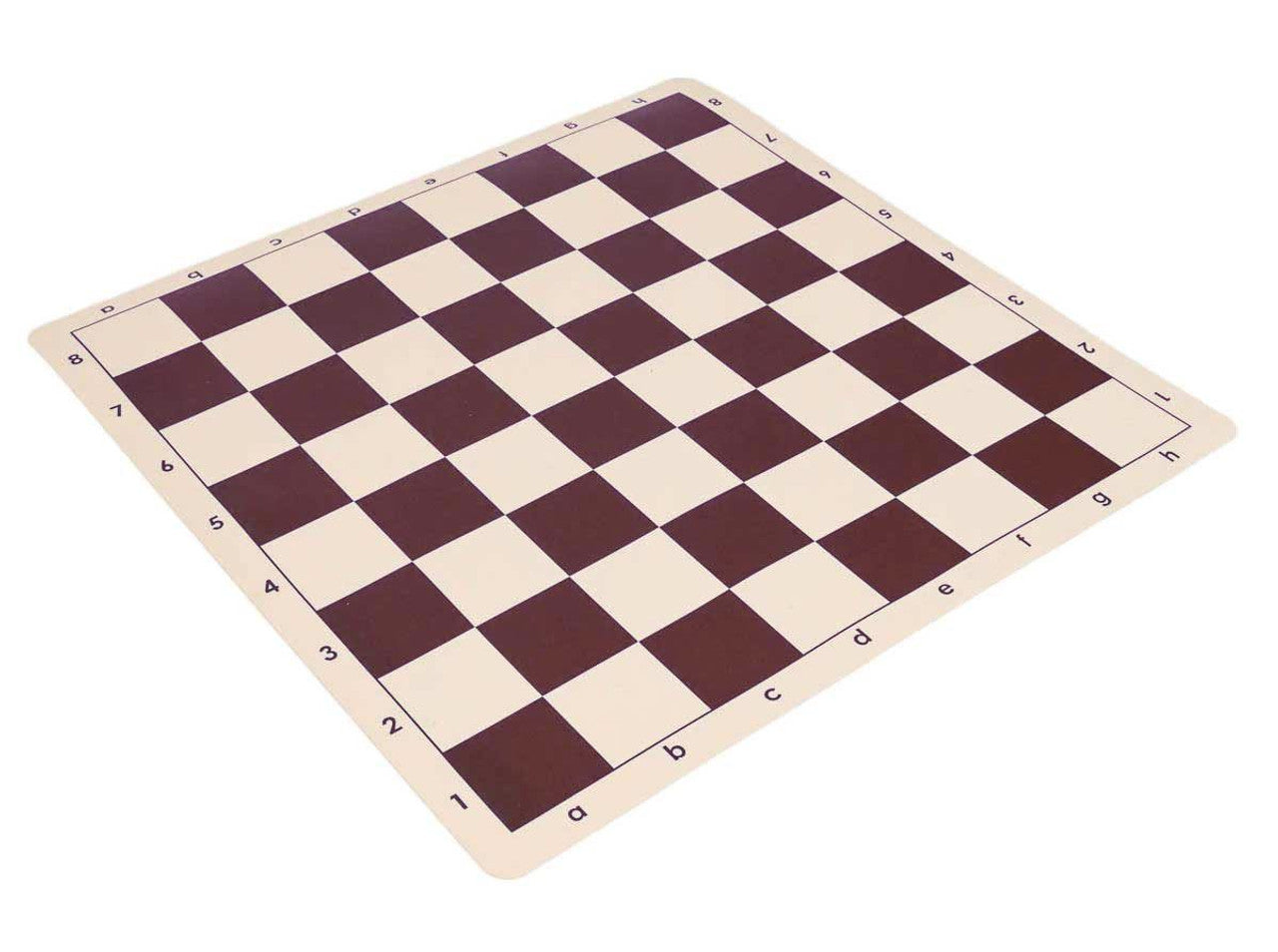 Flexible silicone chess board that easily rolls or folds for convenient storage and transport. Features clear algebraic notation for learning and analysis. Measures 19.5" x 19.5", providing durability and portability for both casual and competitive play.