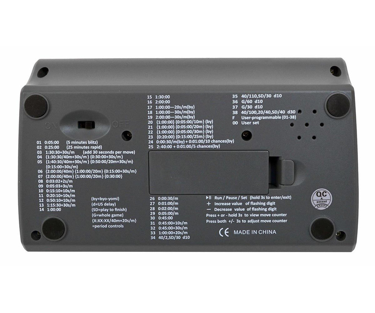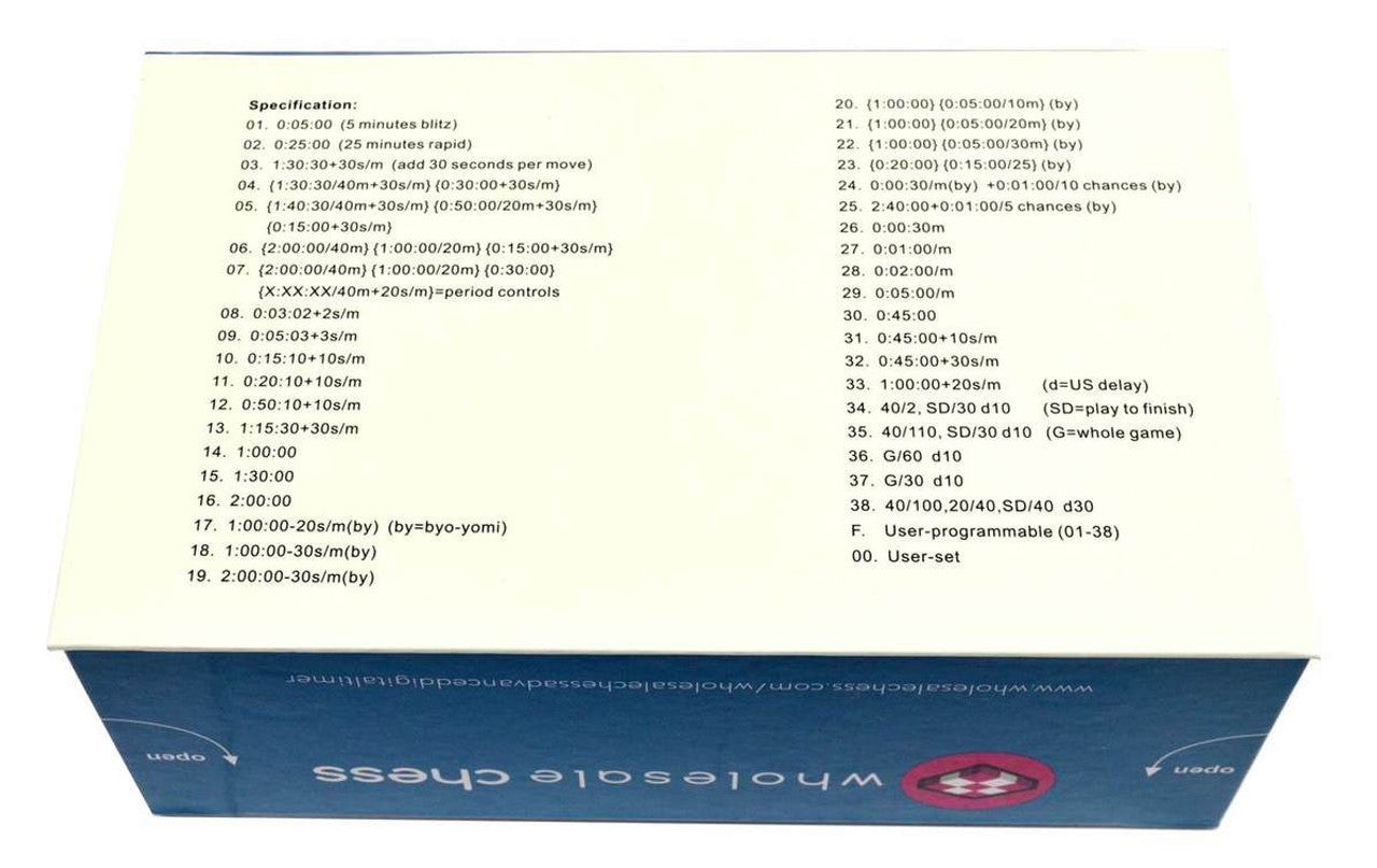 Engineered for both competitive and casual play, the Advanced Digital Chess Clock offers 38 pre-programmed modes plus fully adjustable bonus and delay settings to suit any time control. Featuring a high-contrast, easy-to-read display and intuitive button layout, it’s ideal for tournaments, clubs, schools, and home games alike. Built for reliability, versatility, and tournament readiness, this clock ensures every game is timed with precision.